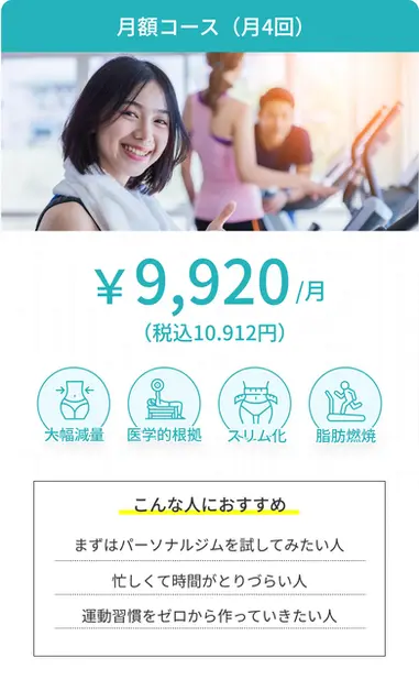 減量幅に自信がございます。1ヶ月で-9kg減は、元の体重や体質にもよりますが多くの会員様が達成しております。通常のパーソナルジムですと、3ヶ月くらいかかるかと思います
